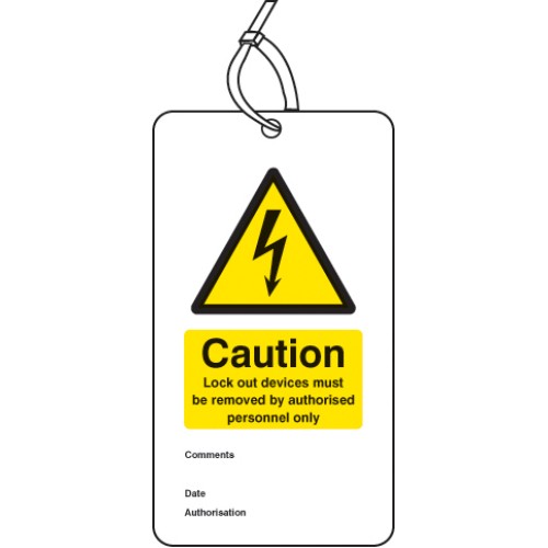 This double sided safety tag warns viewers that lock out tag out devices must be removed only by authorised personnel.
