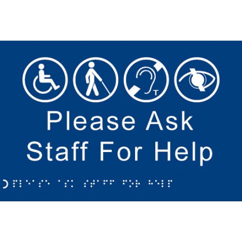 This braille please ring for assistance sign helps ensure people with visual impairment can locate alarms, bells etc. to notify staff. The raised letters, symbol and braille ensures our braille/tactile sign can be read by everyone. Designed to help you meet your obligations under the DDA and Equality Act 2010. Our braille signs have an adhesive backing for easy installation.
