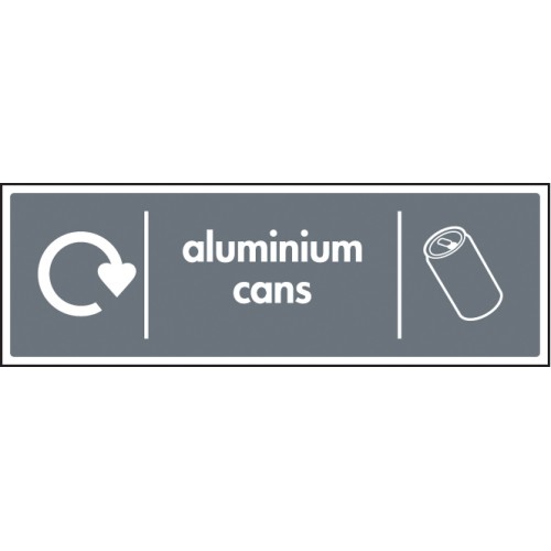 Recycling aluminum cans saves natural resources, reduces energy consumption, and lowers greenhouse gas emissions compared to producing new aluminum from raw materials. The sign supports adherence to WRAP (Waste & Resources Action Programme) standards, helping organisations meet environmental goals and promote sustainable waste management.