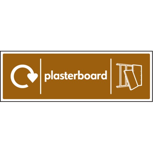 Recycling plasterboard conserves resources by recovering gypsum for reuse, reduces the volume of waste sent to landfill, and lessens the environmental impact of construction projects. The sign supports compliance with WRAP (Waste & Resources Action Programme) guidelines, aiding organisations in meeting their sustainability goals and regulatory requirements.