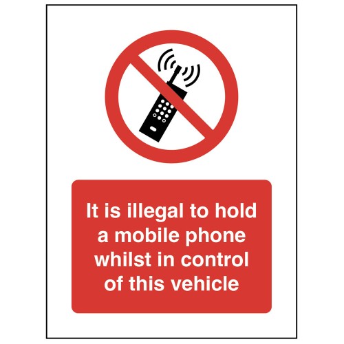 The sign states: It is illegal to hold a mobile phone whilst in control of this vehicle.