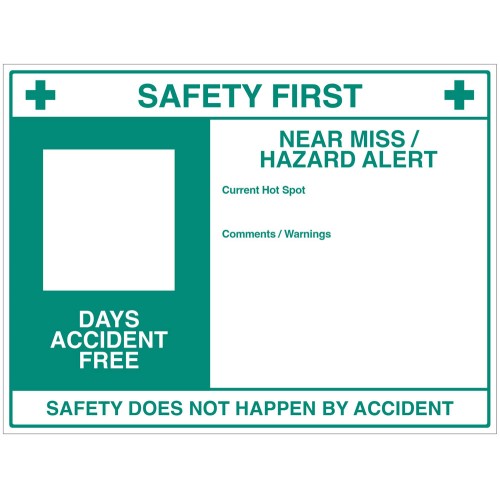 This sign has been manufactured with a specialist dry-wipe surface which allows the sign to be updated time after time with a water based dry-wipe pen. All of our dry-wipe boards enable management to regularly update key information - ideal for businesses who have shift workers. This dry-wipe board enables information such as near miss accidents, hazard alerts, accident hot spots, and accident free days to be noted and updated as reqularly as required.